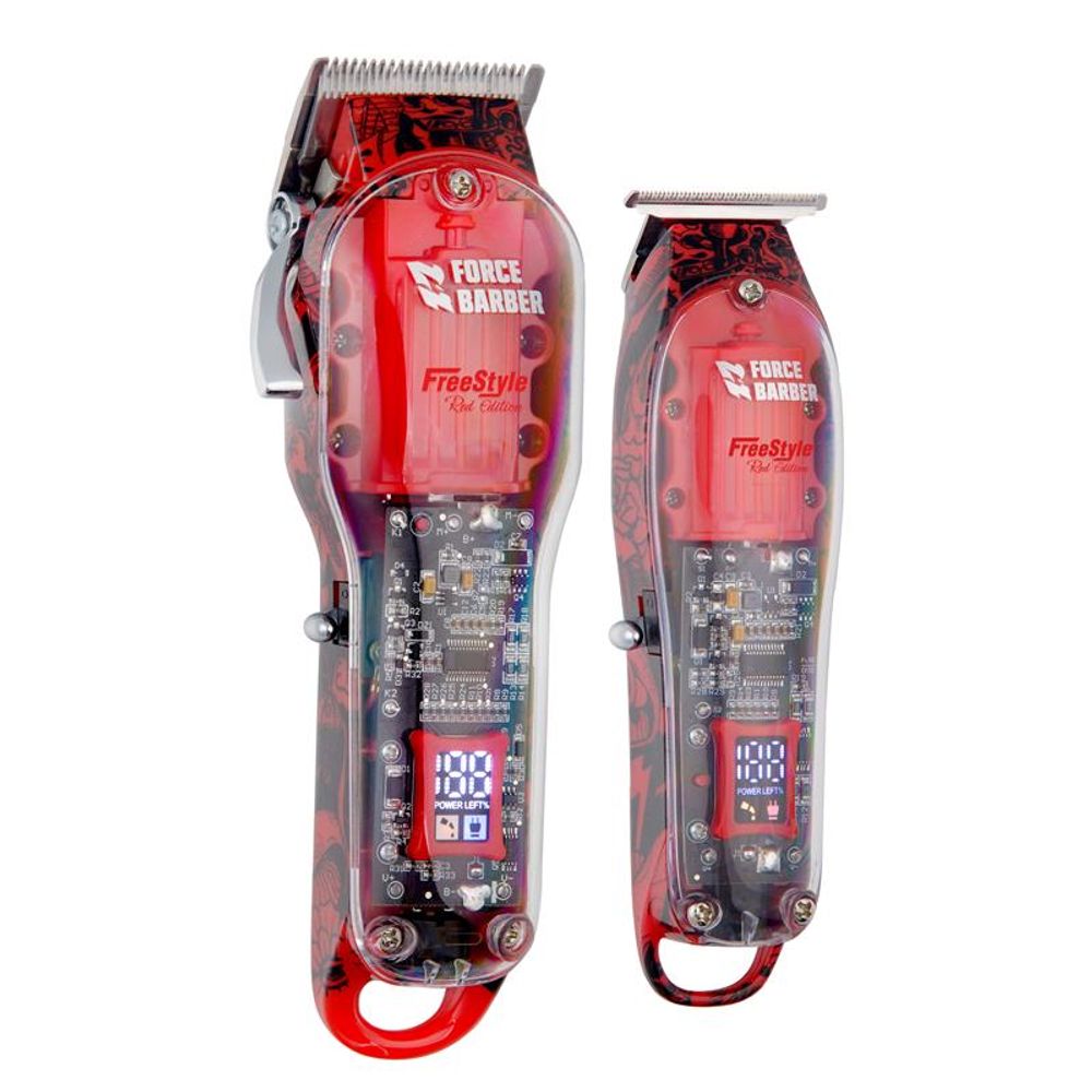 A Máquina de Acabamento Profissional Freestyle Red Edition é a sua chance de ter os cortes rentes e linhas perfeitas das ferramentas Force Barber na sua barbearia. Finalize seus cortes com a máxima eficiência com sua lâmina T-Wide, que facilita a realização de trabalhos artísticos como hair tattoo e freestyle. Sua cor vermelha e estampa de tatuagem apresentam um design cheio de atitude e estilo. A Freestyle Red Edition é uma máquina de acabamento levíssima e com tecnologia inovadora, oferecendo 2 horas de funcionamento ininterruptas e visor indicando o percentual restante da carga da bateria. Entregue acabamentos rentes e com detalhes impressionantes.